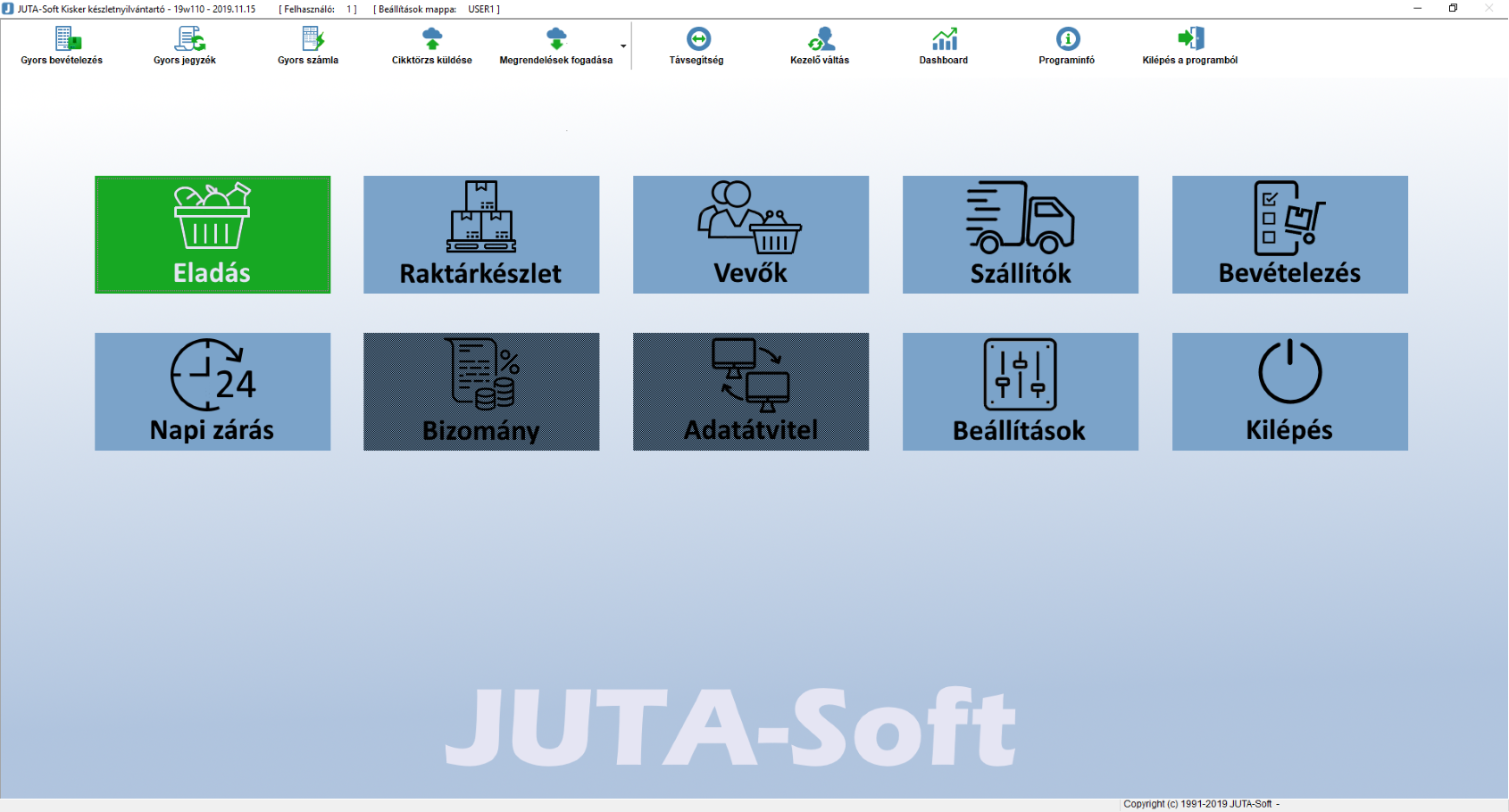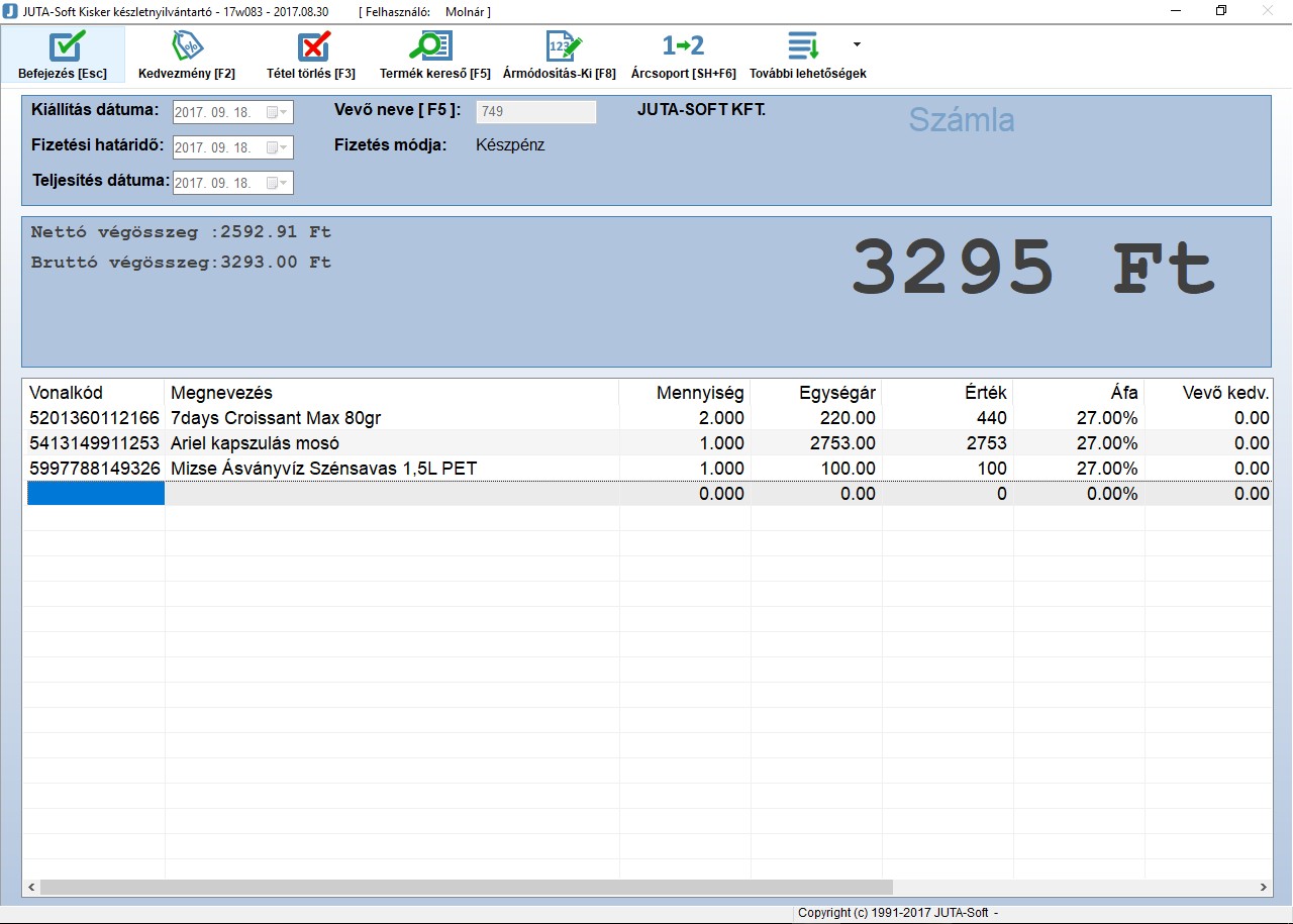 A Juta-Soft Kft. által forgalmazott JUTA-Kisker raktárkészlet nyilvántartó és számlázó program megfelel a 23/2014. (VI. 30.) NGM rendeletben előírtaknak és a 47/2007. (XII. 29.) PM rendelettel módosított 24/1995. (XI. 22.) PM rendeletben, valamint a 2007. évi CXXVII. törvényben előírtaknak, mely szerint a számítógéppel előállított számla, amelynek szigorú számadás alá vonása megvalósul oly módon, hogy a gépi program kihagyás és ismétlés nélkül biztosítja a sorszámozást, és a másolatok alapján a hiánytalan elszámolás biztosított. A számlázó program a számla sorszámokat automatikusan generálja, azokat utólag módosítani nem lehet, a megírt számlák nem módosíthatók, továbbá a 2016. január 1-jétől hatályos 11/A. § értelm ében a számlázó program olyan önálló, de a programba beépített, „adóhatósági ellenőrzési adatszolgáltatás” elnevezésű funkcióval rendelkezik, amelynek elindításával adatexport végezhető. Ez a funkció a programban NAV adatszolgáltatás menüpont alatt található.